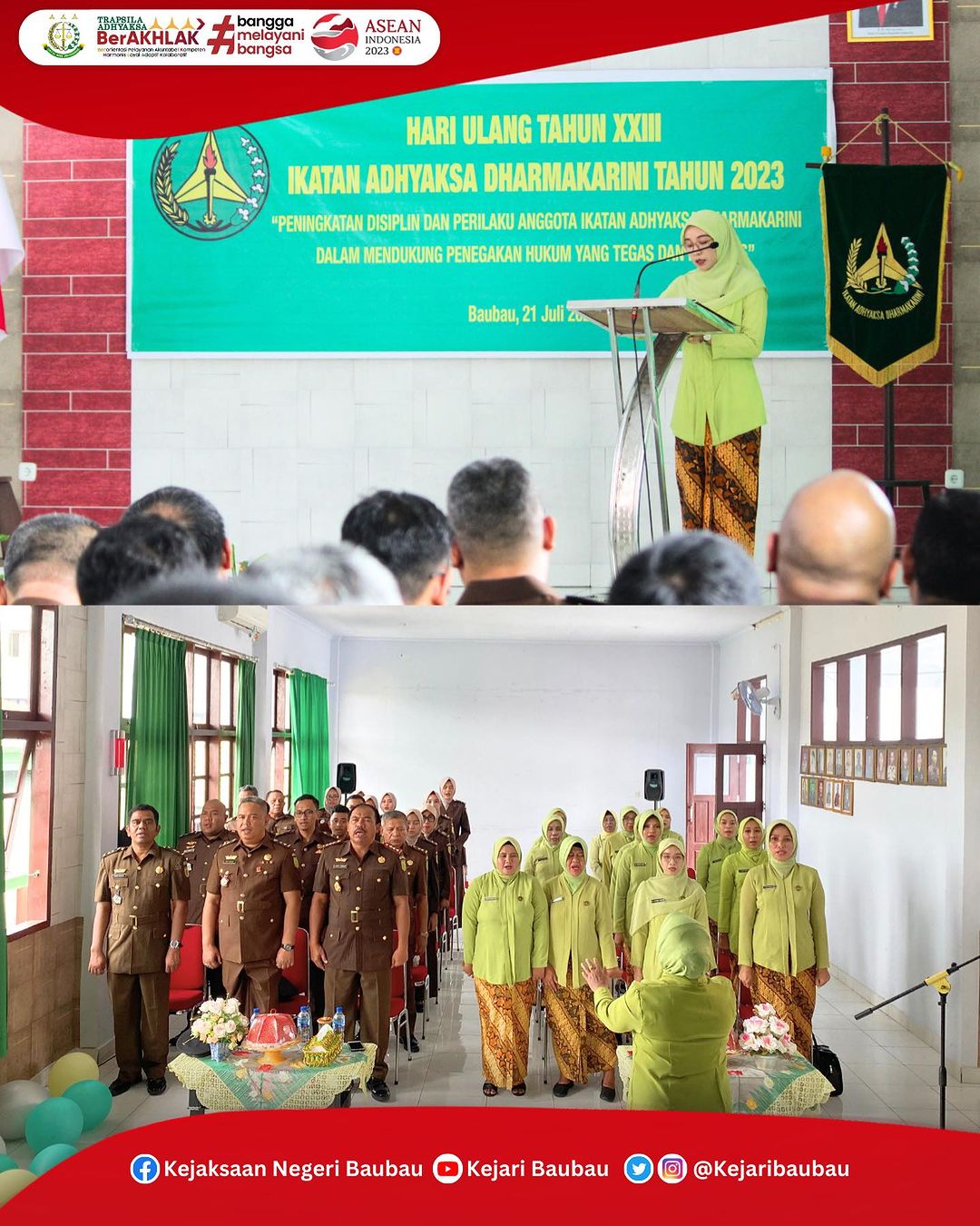 Pelaksanaan Hari Ulang Tahun Ikatan Adhyaksa Dharmakarini (IAD) Tahun 2023 diawali dengan menyanyikan lagu Kebangsaan Indonesia Raya dilanjutkan dengan menyanyikan Mars IAD dan mengheningkan cipta yang dipimpin oleh Kepala Kejaksaan Negeri Baubau.
