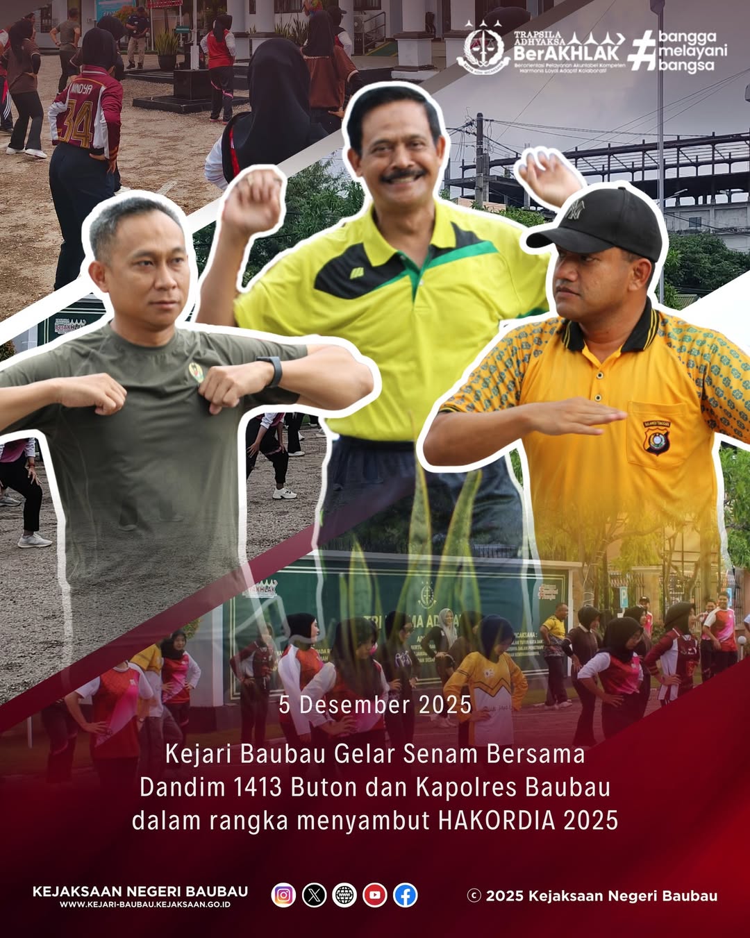 Baubau, 5 Desember 2025 — Kejaksaan Negeri Baubau menyelenggarakan kegiatan senam pagi yang turut dihadiri Dandim 1413 Buton dan Kapolres Baubau. Kehadiran kedua pimpinan tersebut menjadi bukti kuatnya sinergi antara Kejaksaan, TNI, dan Polri dalam menjaga hubungan kerja yang harmonis di wilayah Baubau.