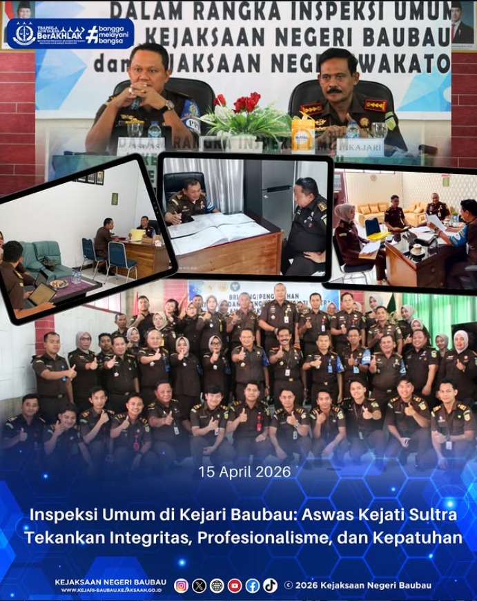 Rabu, 15 April 2026, Asisten Bidang Pengawasan Kejaksaan Tinggi Sulawesi Tenggara melaksanakan briefing/pengarahan dalam rangka inspeksi umum di Kejaksaan Negeri Baubau. Kegiatan inspeksi ini menjadi bagian strategis dalam memastikan pelaksanaan tugas, fungsi, serta administrasi berjalan sesuai dengan ketentuan dan regulasi yang berlaku.