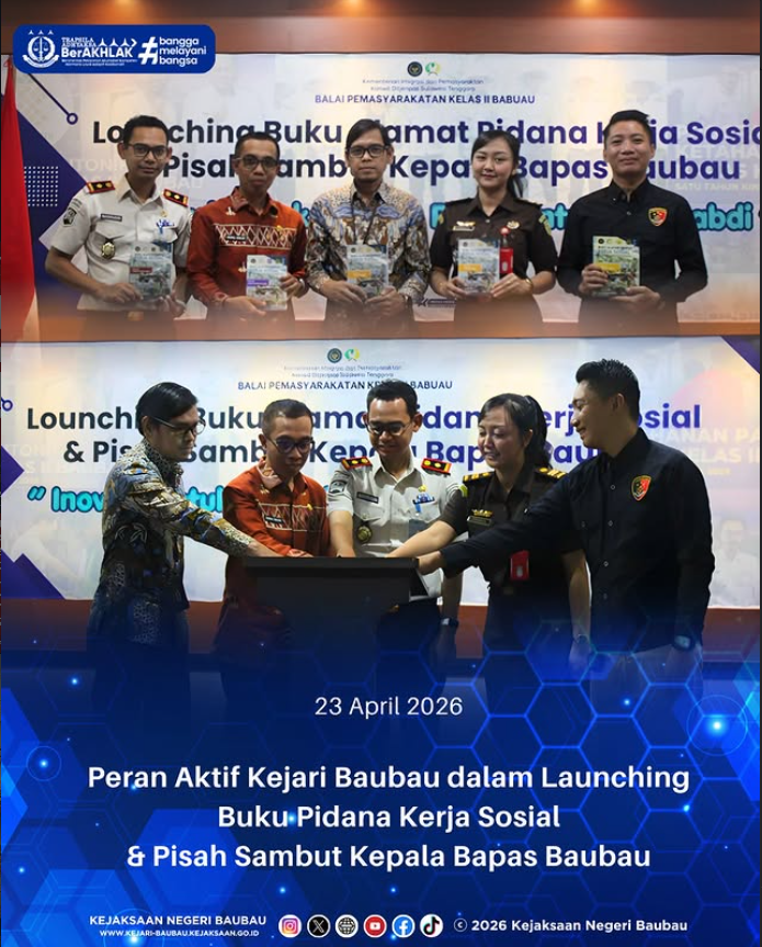 Pada Kamis, 23 April 2026 sekitar pukul 09.40 WITA, bertempat di Hotel Galaxy Inn Baubau, telah dilaksanakan kegiatan Launching Buku Alamat Pidana Kerja Sosial yang dirangkaikan dengan acara Pisah Sambut Kepala Bapas Baubau, mengusung tema “Inovasi untuk Negeri, Pisah untuk Mengabdi”.