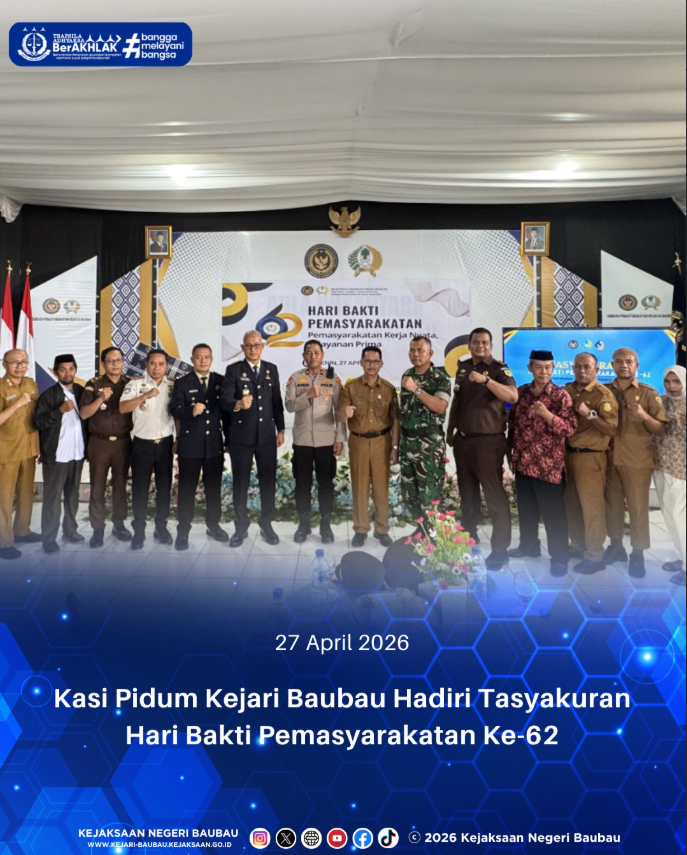 Kepala Seksi Tindak Pidana Umum (Kasi Pidum) Kejaksaan Negeri Baubau, Dedi Wahyudie, S.H., M.H., menghadiri kegiatan Tasyakuran Peringatan Hari Bakti Pemasyarakatan ke-62 sebagai perwakilan Kepala Kejaksaan Negeri Baubau, Fatkhuri, S.H.